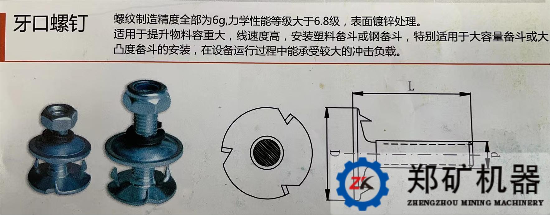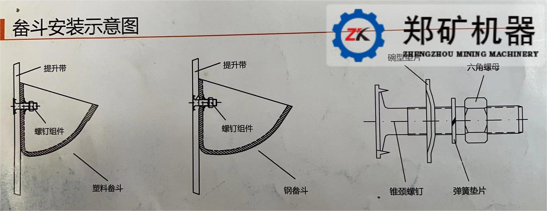 TD型膠帶式提升機(jī)采用膠帶作為料斗的牽引部件。料斗用具有特殊頭部的螺釘(牙口螺釘)固定在帶子上,為了使螺栓的頭部不妨礙膠帶通過滾筒,在料斗的后壁上制有相應(yīng)的凹槽。膠帶的寬度要根據(jù)膠帶的標(biāo)準(zhǔn)選取,帶寬應(yīng)比料斗的寬度在30-40mm。帶的帆布層數(shù)應(yīng)根據(jù)帶子所受的最大牽引力計(jì)算確定(通常不少于4層),計(jì)算方法同帶式輸送機(jī),但由于膠帶上鉆了連接料斗的孔,降低了膠帶的強(qiáng)度,所以應(yīng)比膠帶輸送機(jī)驗(yàn)算膠帶強(qiáng)度的安全系數(shù)增大10%左右。
