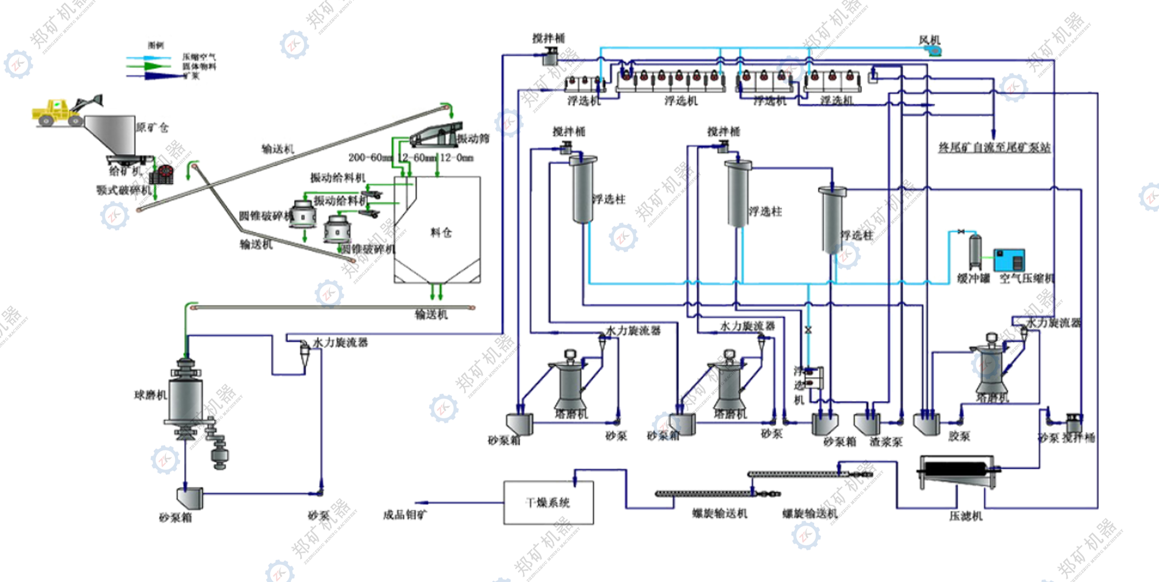 選礦生產(chǎn)線主要由顎式破碎機、球磨機、分級機、磁選機、浮選機、濃縮機烘干機,用給料機、升降機和輸送機作為增補。此生產(chǎn)線具有高效、低能耗、高產(chǎn)量、經(jīng)濟合理的優(yōu)點。